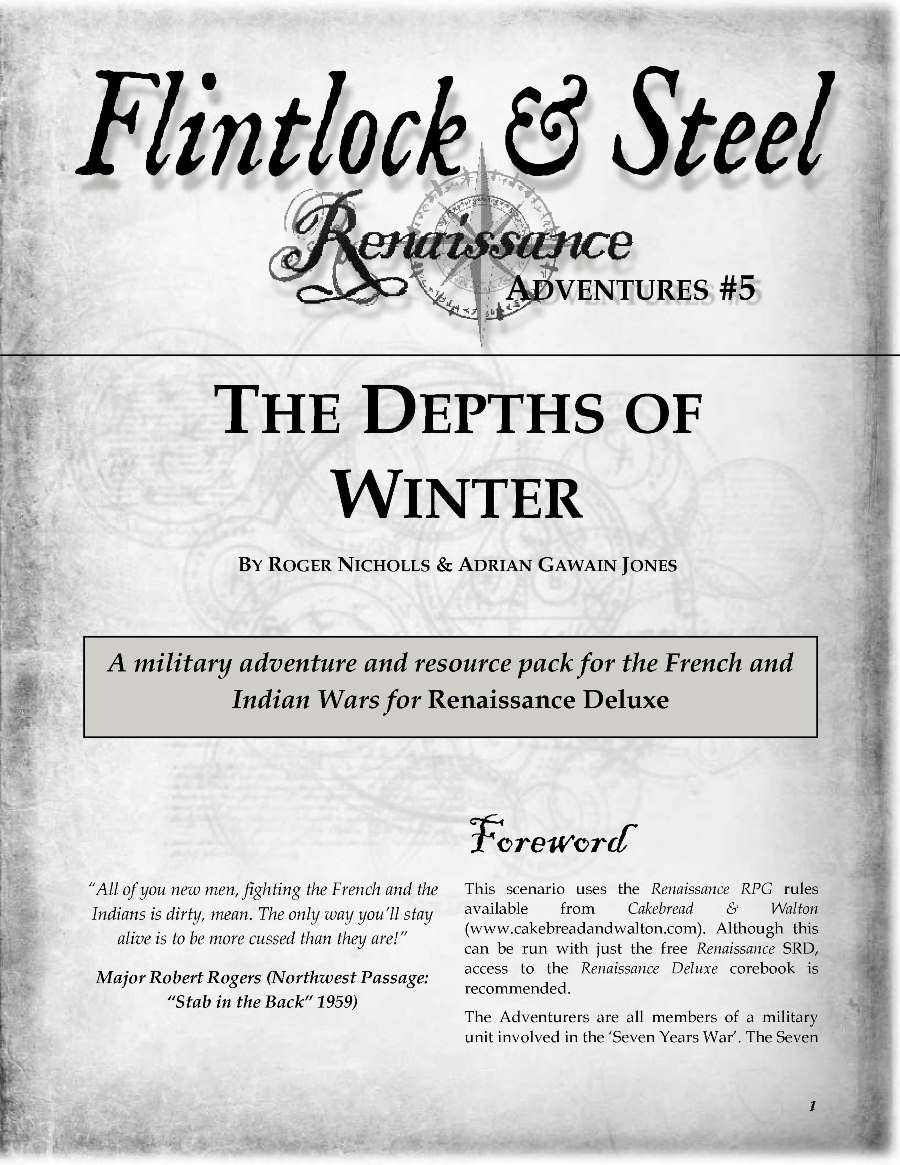 The Adventurers are all members of a military unit involved in the French and Indian Wars. The events take place in the Colonial North East, on the border between the modern day United States of America and Canada. A determined party of Rogers' Rangers must trek through the depths of winter to raid a French fort. Includes an adventure and resource pack for the period. Requires the Renaissance Deluxe rules.