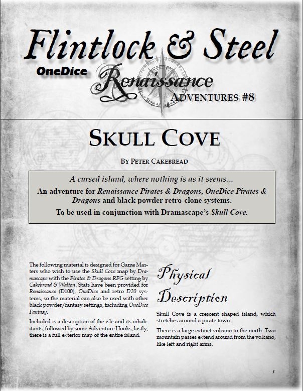 This adventure for Pirates & Dragons includes statistics for both the Renaissance and OneDice versions of the game, as well as retro-clone stats. It is intended to be used with the large scale colour map of Skull Cove presented by Dramascape. Both can be bought together - look for the discounted bundle!